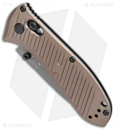 This SHOT Show exclusive manual Mini Presidio II model sports a burnt bronze aluminum handle and a gray finished blade made from CPM-M4 steel. Benchmade has updated their legendary Presidio model with a smaller build and performance upgrades. This combat legend has a black anodized 6061-T4 billet aluminum handle with Benchmade’s AXIS lock system for effortless one-handed opening and closing. Milled grooves in the handle improve grip while adding a modern flair to the design. The Presidio II has a slightly larger blade and handle that is built to perform well as a tactical or everyday carry knife. Item includes a Cordura sheath with snap retention and a Malice Clip.